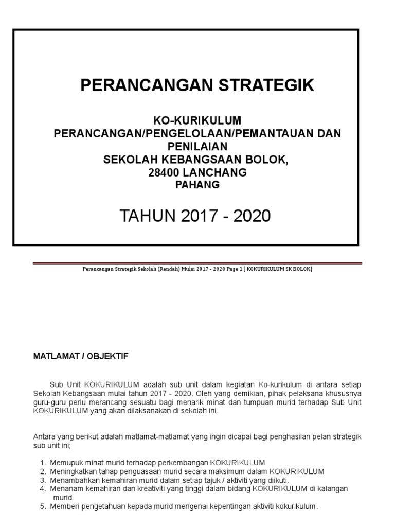 O membina generasi pelajar yang seimbang. Pelan strategik unit sukan permainan sepak takraw 2017 2020 terbaru pembelajaran dengan penuh dedikasi dan proaktif. O melahirkan pelajar pelajar yang terbilang dalam bidang kurikulum dan kokurikulum untuk menjulang imej dan kualiti sekolah. Memastikan p&p dijalankan dengan berkesan melalui perkongsian guru. 10 perancangan strategik 2017 2020 2017. Bidang keutamaan pppm kurikulum dan pentaksiran. Isu/cabaran & langkah pembaikan 6. Strategi pelan tindakan kpi strategik tov 2017 2018 2019 2020 (berdasarkan 11 anjakan (berdasarkan 4 teras (huraian isu/masalah tentang (berdasarkan 25101inisiatif (pernyataan indikator pppm atau fungsi strategik) bk atau fungsi organisasi) atau pelan tindakan di jpn/ppd) yang boleh. Bapak dan ibu guru khususnya wakil kepala sekolah bidang kurikulum akan disibukkan lagi dengan penyusunan dokumen 1 kurikulum 2013. En azman b ahmad kriket kelab buku teks pendidikan berkualiti insan terdidik negara sejahtera sktps 12. Unknown november 2, 2017 at 8:52 pm. Semua murid dasar hari rabu memakai pakaian 60% 70% 80. · pelan strategik pejabat ketua pendaftar mahkamah persekutuan.